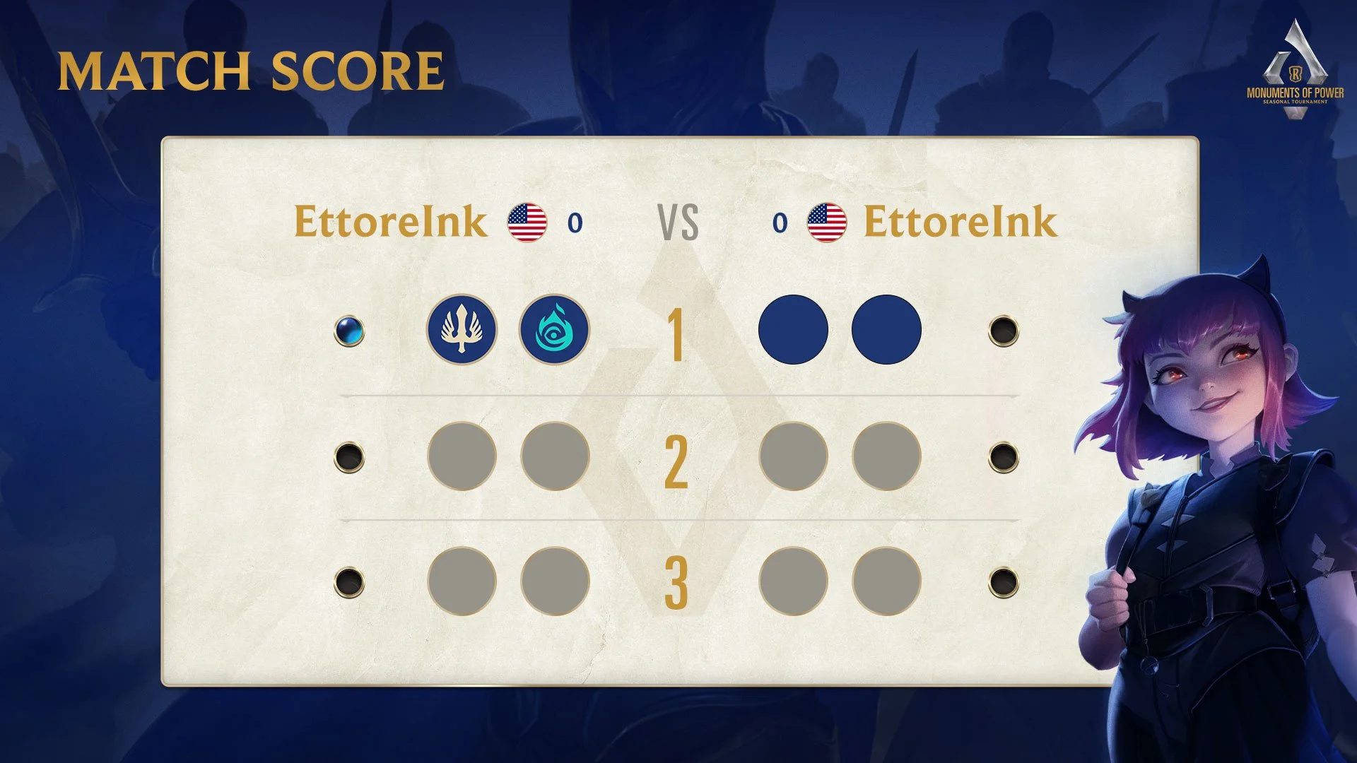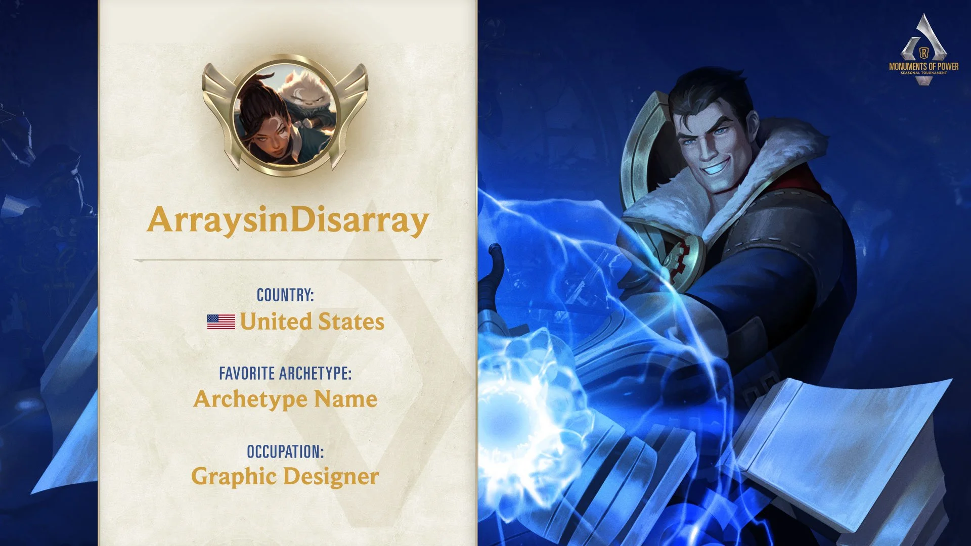 In addition to pre-production design work, I served as the main live designer. This role involved participating in the live production call with the team, creating assets on the spot for immediate use in the broadcast. One crucial asset I created was the champion cards (shown to the right), representing each deck a player uses. Each of the 32 players had three decks. The challenge was that these assets needed to be created on the day of the broadcast due to tournament requirements, which prohibited deck submissions until 15 minutes before the show started. This necessitated not only highly organized file formatting but also a deep knowledge of all regions and champions, as I had to assign them on the fly.